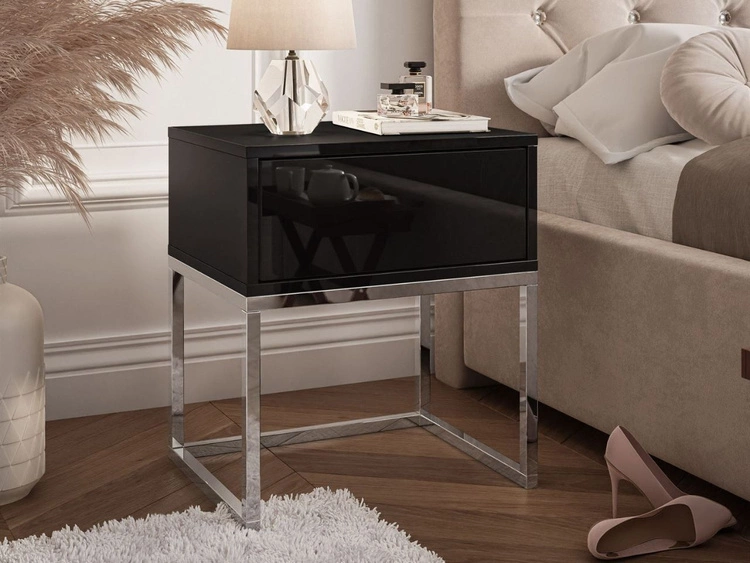 Nachttisch Glamour mit Schublade und silbernen Gestell Brisa Schwarz Hochglanz