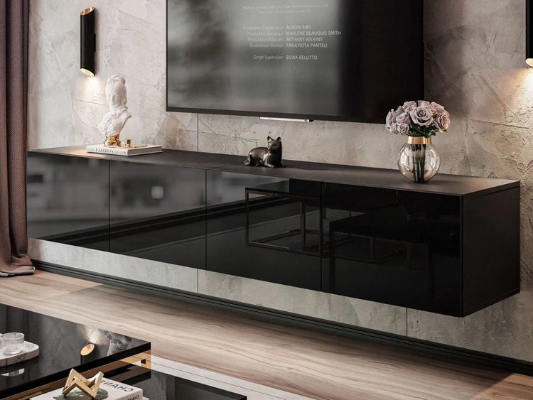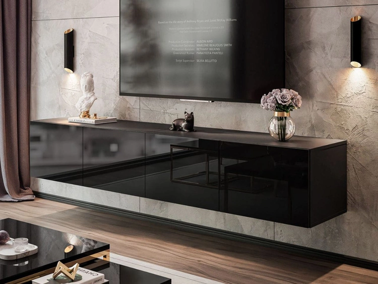 Hängende Wohnwand für das Wohnzimmer mit LED-Beleuchtung Nodoo Schwarz Hochglanz