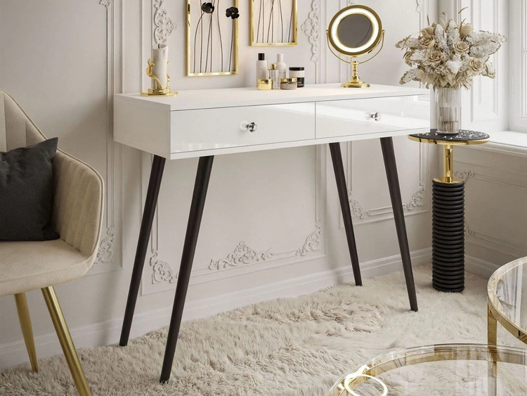 Schminktisch mit Schubladen, schwarzen Beinen und LED-Beleuchtung Olivine Weiß Hochglanz