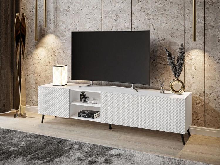 TV-Schrank mit schwarzen Kunststoffbeinen und 3D-gefrästen Fronten Celiane Weiß Glanz