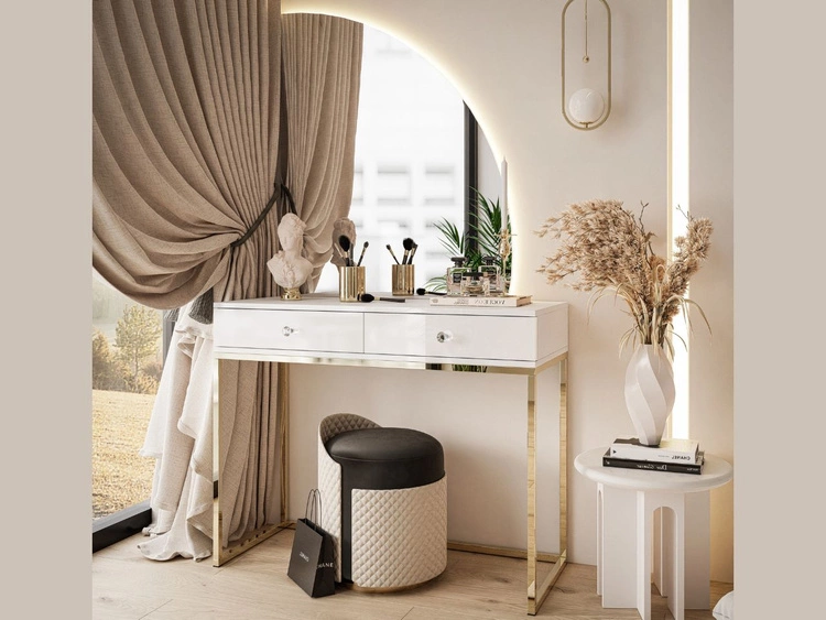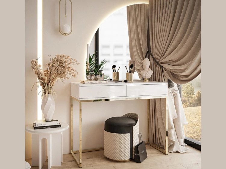 Kosmetiktisch rechtsseitig mit Schubladen und LED-Beleuchtung auf goldenen Beinen Clarette Weiß Hochglanz