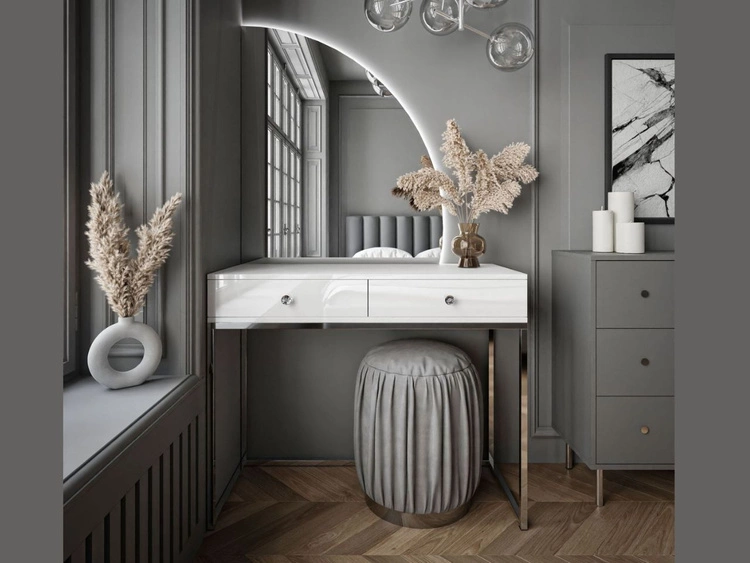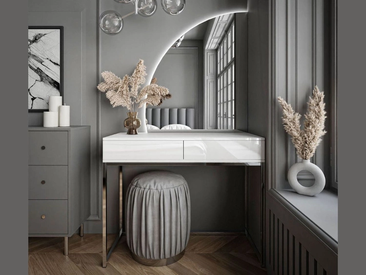 Kosmetiktisch rechtsseitig mit Schubladen und LED-Beleuchtung auf silbernen Beinen Clarette Weiß Hochglanz