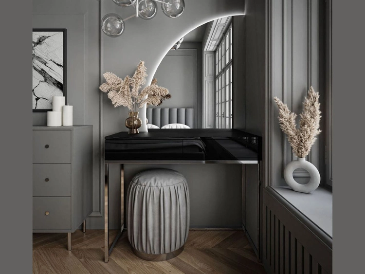 Kosmetiktisch rechtsseitig mit Schubladen und LED-Beleuchtung auf silbernen Beinen Clarette Schwarz Hochglanz