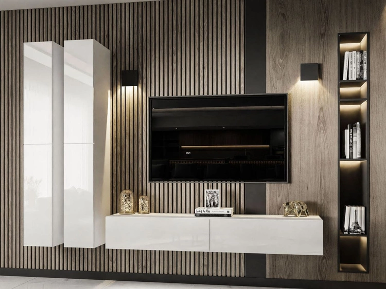 Anzahl der Produkte: 46Hängende Wohnwand mit LED-Beleuchtung für das Wohnzimmer Sorelle Weiß Hochglanz