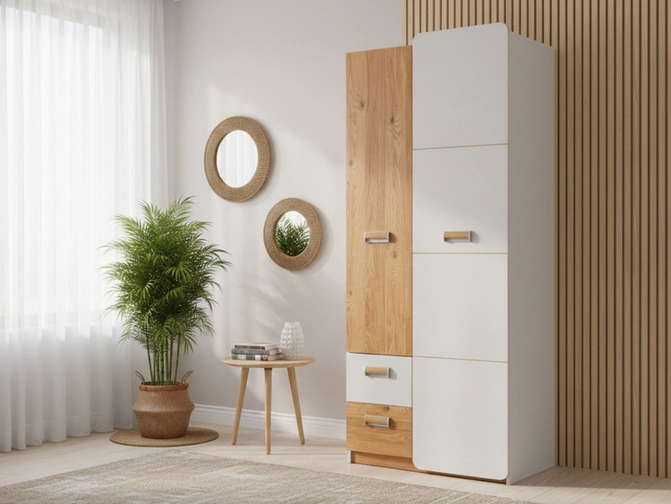 Kleiderschrank mit einer Tür 45 cm, mit Einlegeböden Lindo Weiß, Nash Eiche