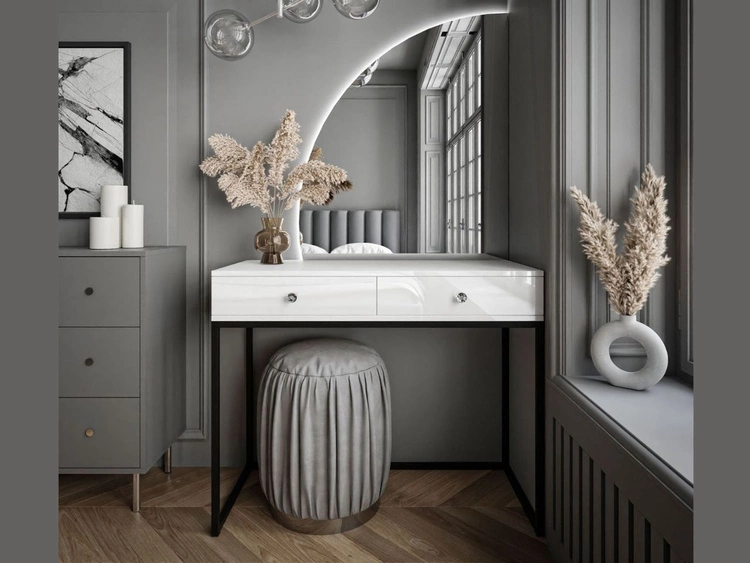 Kosmetiktisch rechtsseitig mit Schubladen und LED-Beleuchtung auf schwarzen Beinen Clarette Weiß Hochglanz